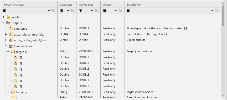 The RTDE address space does not have hierarchy, and variables can only be read/write as a whole as part of recipe data packages. However, since the Connectivity core only handles basic data types, the RTDE connection plugin provides access to components of vector variables and single bits of integer variables. The single bit access is needed because the controller's digital inputs and outputs are only available as integers, not single Booleans. The connection plugin also provides read access (writing not supported) to vector output variables from the controller as strings. The vector's elements are converted to decimal strings, using full precision for floating point values and a period "." as decimal delimiter. The element strings are then joined with a single space character as delimiter.