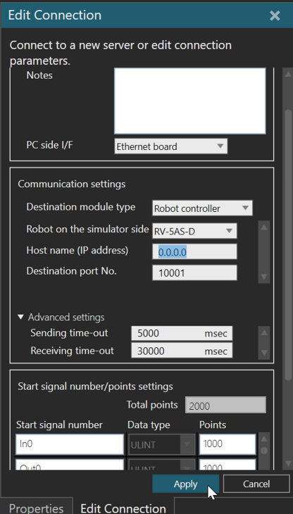 A MELFA Robot plugin connection requires a MELFA robot controller to have an IP address. Each connection in Visual Components is a client to the controller and is not meant to remotely operate the robot.