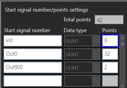 - Each row defines a range of signals. As an example, In0 with 8 as the point count corresponds to inputs 0-7 on the controller.
