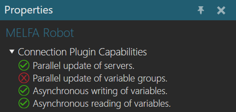 You can verify the capabilities of the MELFA Robot plugin and subsequent server connections in the Properties panel.