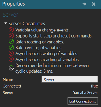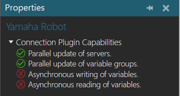 You can verify the capabilities of the Yamaha Robot plugin and subsequent server connections in the Properties panel.
