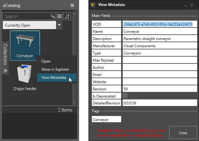 By default, a layout references a component by its VCID, a unique key for identifying and loading the component in the 3D world. The VCIDs of components along with other items are saved in a layout. This includes any content in the drawing world as well as the configuration for components (location, property values, connections).