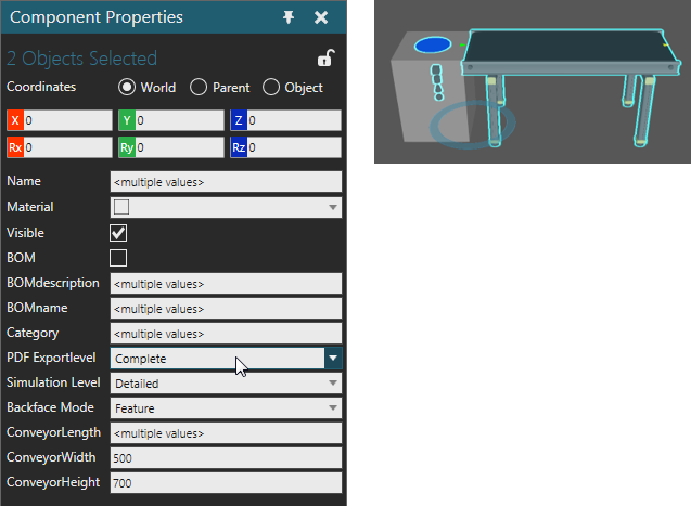 When a component is selected, you may manipulate it as well as edit its properties. When two or more components are selected, you can manipulate all of the selected components as well as edit any matching properties that can have the same value. For example, components cannot have the same name, but they can have the same PDFExportLevel mode.