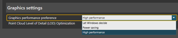 The Graphics settings allow you to select the graphics performance of your Visual Components product. These settings match the Graphics preference panel in Settings in Microsoft Windows in for example the following location inside the operating system settings: