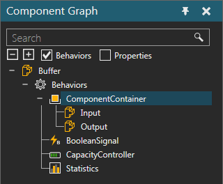 The ports of a Component Container are listed with the behavior in the Component Graph panel.