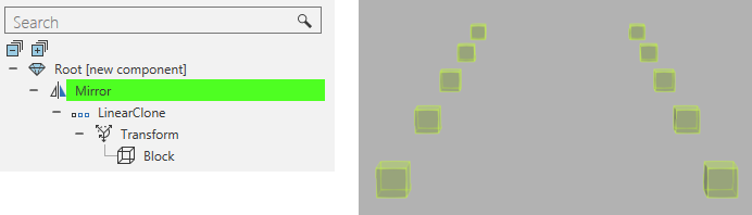A Mirror feature mirrors and scales its child features in one to three axes.