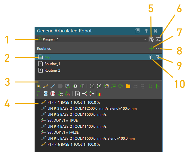 ロボットのプログラムはレイアウト内のロボットと共に保存されます。プログラムには複数のルーチンを含めることができ、そのうち 1 つがメインルーチンとして設定されます。シミュレーション開始時、メインルーチンが実行を開始します。