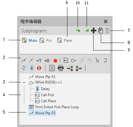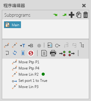 程序编辑器面板可以让您查看和编辑机器人程序,预览动作,以及使用RSL语句为其它类别的组件编程。