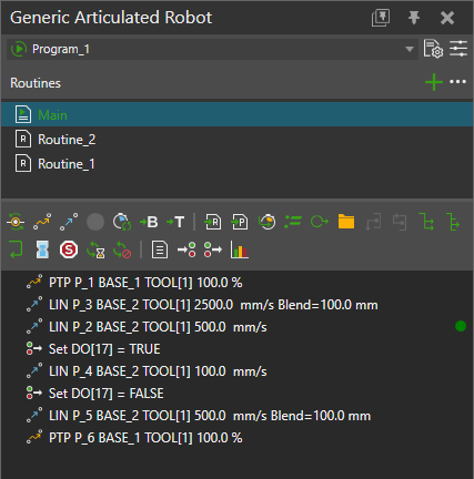 机器人的程序与机器人一起保存在布局中。程序可以包含多个例行程序,其中一个被设置为主例行程序。仿真开始时,主例行程序将开始运行。