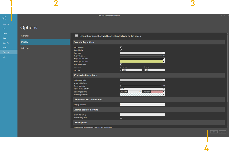 | Options | Displays a set of options/preferences for configuring Visual Components Robotics 5.0. |